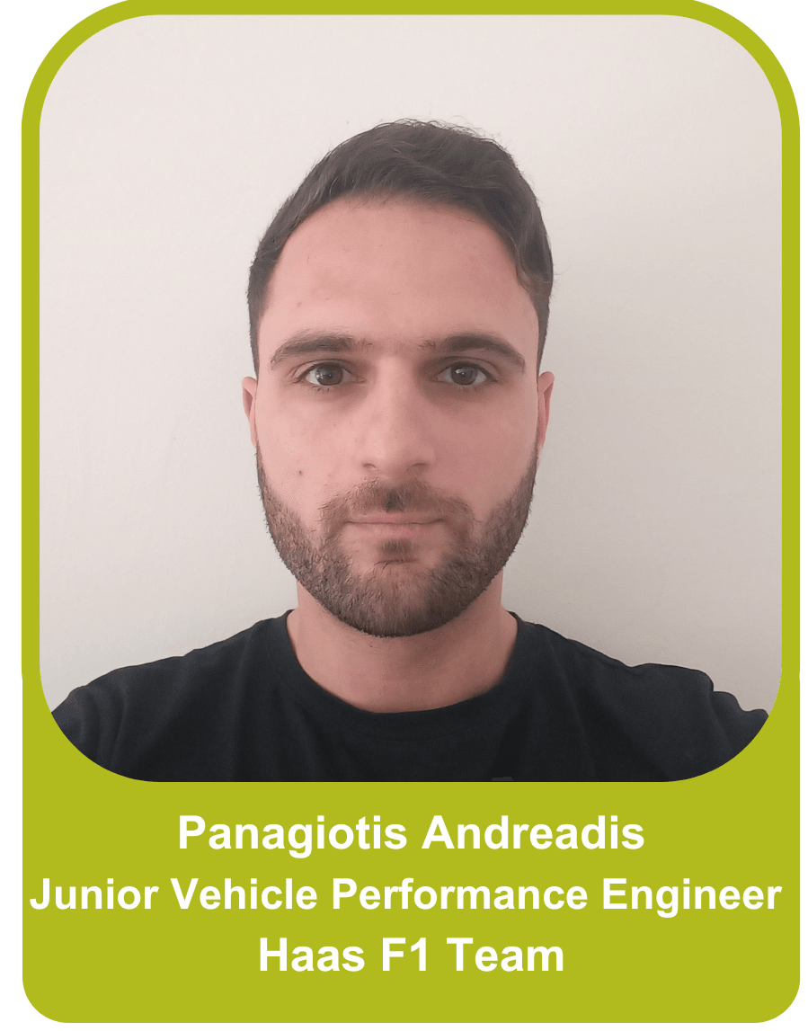 Panagiotis studied mechanical engineering (5-year diploma) in Greece and afterwards completed a master of Science in motorsport engineering in the UK. In 2022 he joined MoneyGram Haas F1 Team as a Vehicle Dynamics Intern. After completing his internship he continued his career as a Vehicle Performance Engineer as a member of Vehicle Performance Group. His focus area is vehicle dynamics and vehicle performance optimisation using offline simulations and through the development of performance and data analysis tools. He also provides race support during race from the factory and occasionally attends testing events as a trackside performance engineer.