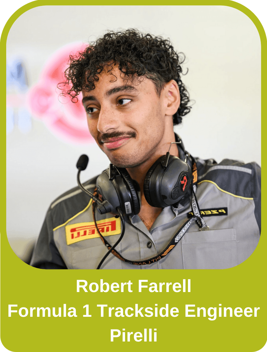Robert’s professional career started with Avon Tyres Motorsport, as their motorsport product development engineer, alongside this he studied for a Masters in Advanced Motorsport Engineering. Robert worked trackside as support engineer to multiple race series, at a variety levels. His main series was ‘The Road to Indy series’ supporting Indycar and working with Indy lights (now Indy NXT). In 2021, Robert attended the MIA school of Race Engineering. In 2023 he began working with Goodyear, supporting WEC and ELMS, completing the LeMans 24 and also assisting development for LMGT3. Robert now works for Pirelli Motorsport as a Formula 1 Trackside Engineer, last year working for Haas F1 and currently assigned to Kick Sauber attending every race.